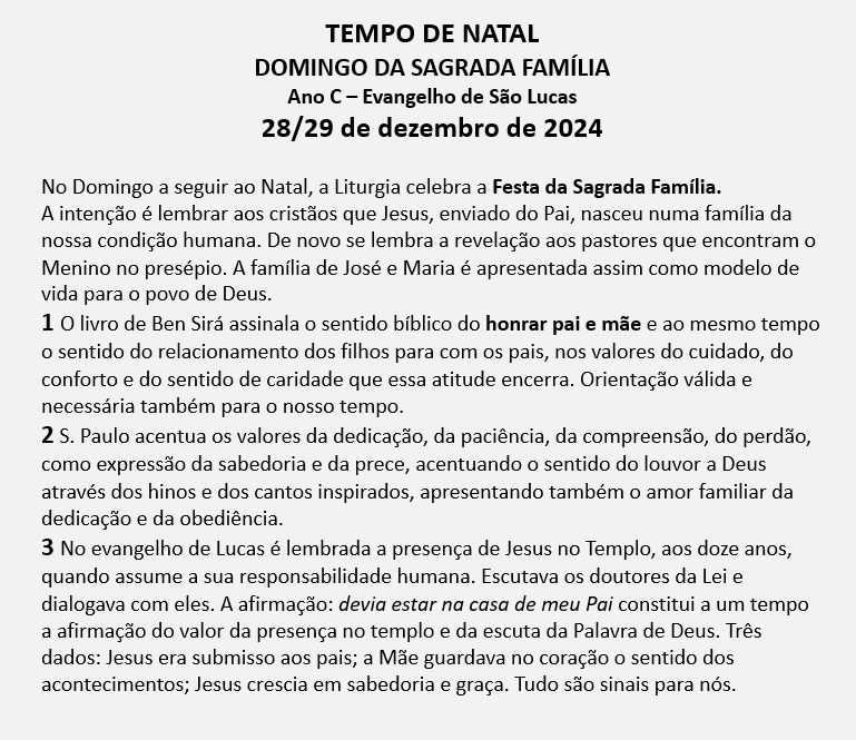MENSAGEM DA FESTA DA SAGRADA FAMÍLIA DE JESUS, MARIA E JOSÉ - 29 DE DEZEMBRO DE 2024