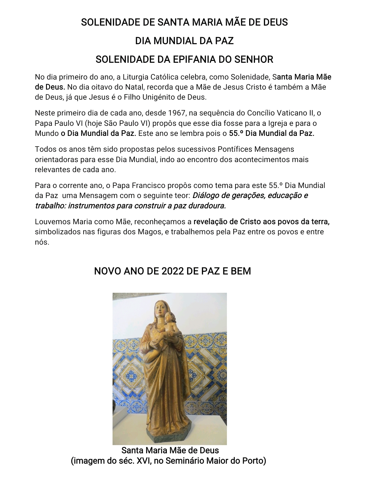 SOLENIDADE DE SANTA MARIA MÃE DE DEUS - DIA MUNDIAL DA PAZ - SOLENIDADE DA EPIFANIA DO SENHOR
