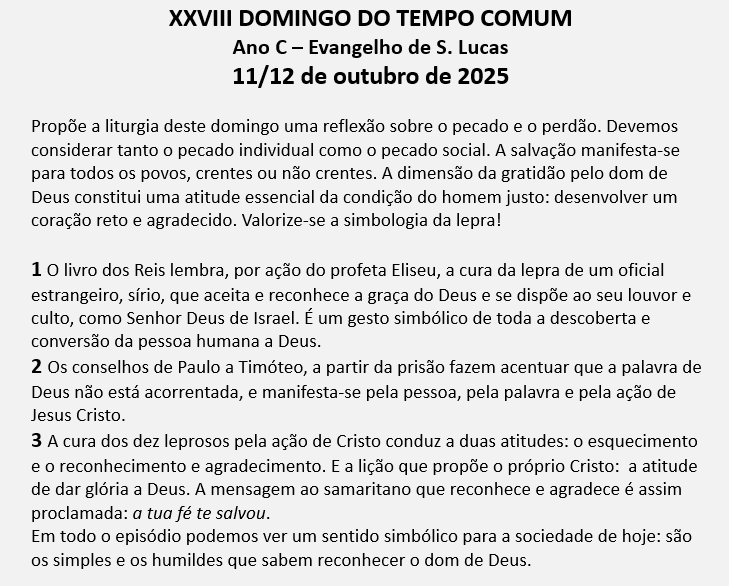 MENSAGEM DO XXVIII DOMINGO DO TEMPO COMUM - 12 DE OUTUBRO DE 2025